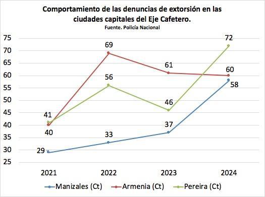Cuando se revisa el panorama nacional de las denuncias por extorsión (en tasa por cada 100 mil habitantes) para el 2024 el Quindío ocupó la casilla 17, seguido de Risaralda en la 19 y Caldas en la 27. En el 2025 Quindío se ubicó en el puesto 12, Risaralda en el 20 y Caldas en el 25. Es decir, en los últimos dos años ninguno de los departamentos del Eje Cafetero ha estado entre los 10 con mayor cantidad de denuncias por extorsión. Los departamentos de Meta, Chocó, Guaviare y Atlántico han encabezado la lista los dos últimos años.
