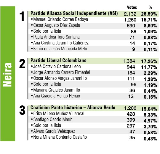 Asimismo, la cabeza de lista del ASI (Manuel Orlando Correa) sacó 1.260 sufragios siendo el más votado entre los 48 candidatos. En Neira el Partido Liberal es la segunda fuerza política más votada mientras que Érika Muñoz, cabeza de lista del Pacto Histórico fue la que más votos obtuvo entre su colectividad (428) sacando 29 votos de ventaja sobre Santiago Osorio (399), actual representante a la Cámara.
