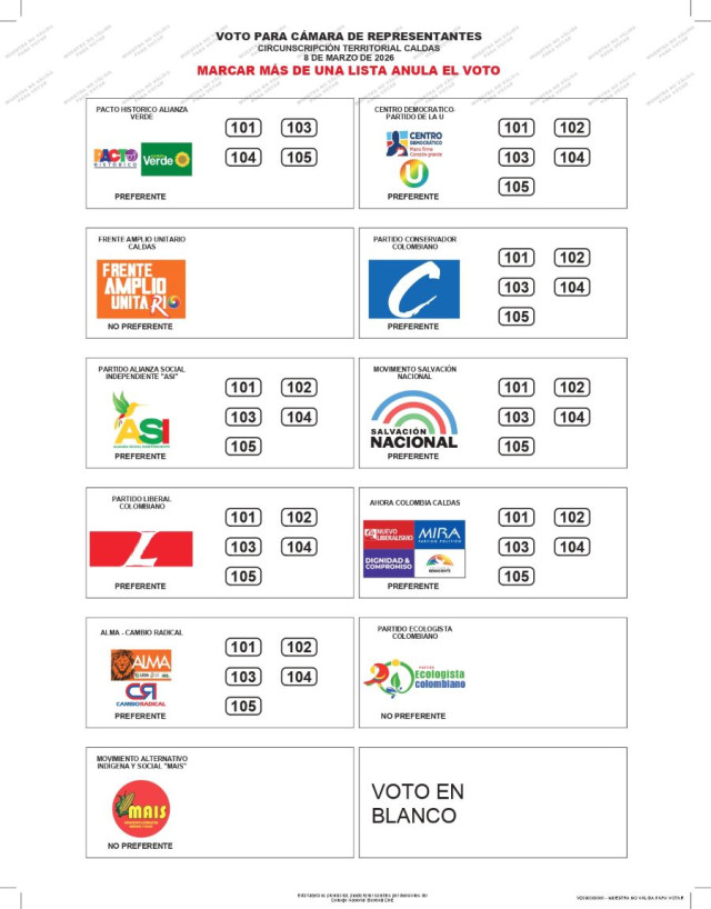 Es de circunscripción territorial. Eso significa que usted puede votar solo por los candidatos que representen al departamento, en este caso, Caldas. Al dirigirse a su puesto de votación identificará esta tarjeta con el color café. En ella encontrará listas abiertas (voto preferente) y listas cerradas (voto no preferente).