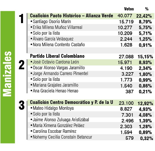 El Pacto Histórico en Manizales lideró las votaciones en las pasadas elecciones al Congreso de la República con 40.077 votos que equivalieron al 22,22%, sacando una amplia ventaja frente a los partidos tradicionales: Liberal (27.088 votos) y Conservador (20.817).