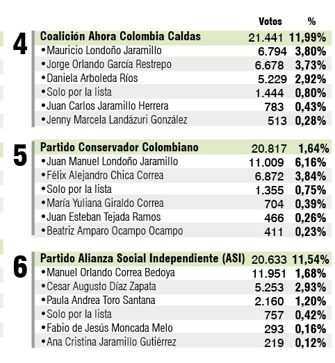Aparte del liderazgo del partido de la izquierda en la capital de Caldas, otra sorpresa en estos comicios fue la baja votación de la exconcejal Paula Andrea Toro (2.160 votos), del partido Alianza Social Independiente (ASI), así como la del exdiputado Mauricio Londoño (6.794 votos), de la coalición Ahora Colombia.