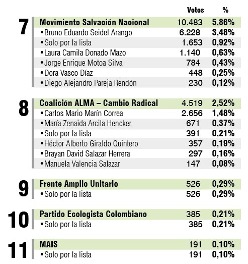 También es de anotar que el único con experiencia en la lista que integraba Hidalgo Montoya era Jaime Alonso Zuluaga, exrepresentante a la Cámara, quien solo obtuvo 2.496 votos.