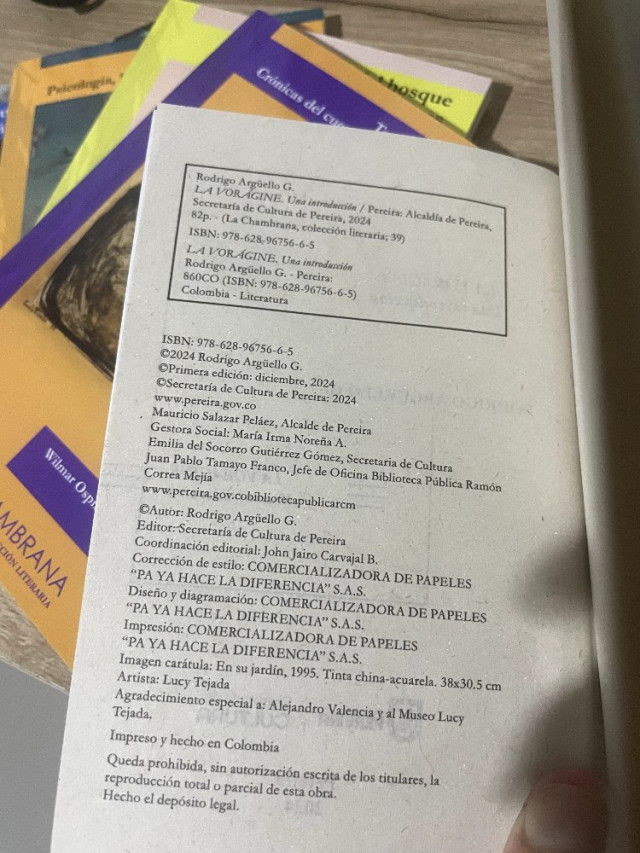 Los libros fueron impresos entre enero y febrero de 2025 –aunque en los libros aparezca 2024–. Además de la imprecisión en la fecha, aparece el nombre de María Irma Noreña con los funcionarios responsables del libro –incluso por encima de la secretaria de Cultura y el director de la Biblioteca pública.