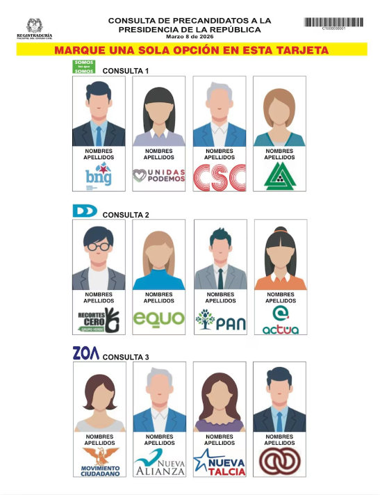 Este es el formato de la tarjeta electoral para la consulta presidencial que dio a conocer la Registraduría Nacional del Estado Civil.