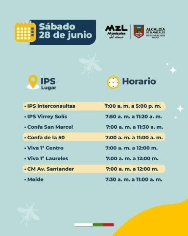 Aproveche el descanso sabatino y vacúnese contra la fiebre amarilla, virus potencialmente mortal por el que se mantiene la alerta epidemiológica en Caldas. Acuda a los sitios donde habrá disponibilidad del biológico este 28 de junio en Manizales.