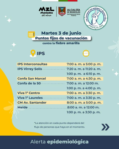 La Secretaría de Salud Pública de Manizales dio a conocer dónde se inmunizará este 3 de junio en la ciudad, con ayuda de IPS que se unen a la campaña protectora. Están conscientes de que este virus es potencialmente mortal. En Neira, a finales de marzo, cobró la vida de un ciudadano de 59 años años. Es hasta ahora la única víctima para lamentar y solo se han dado registros sospechosos, que se han desvirtuado con el paso de los días (en entidades de Manizales se atendieron dos pacientes importados de Ibagué).