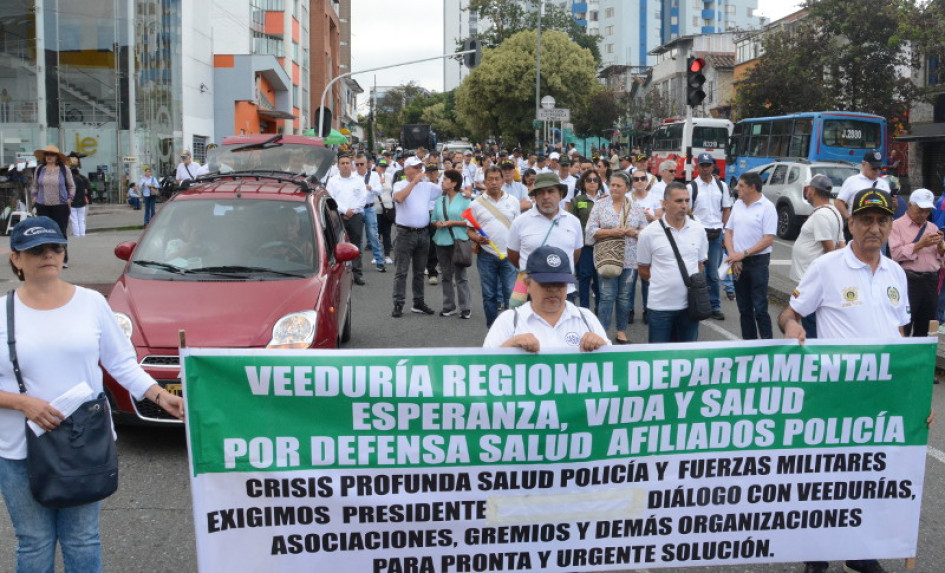 Gloria Sánchez Manrique, veedora en salud en la Policía Nacional, encabezó la marcha en la que la acompañaron no solo pensionados; también caminaron -a su lado- beneficiarias que se han visto afectadas por las decisiones de sanidad.