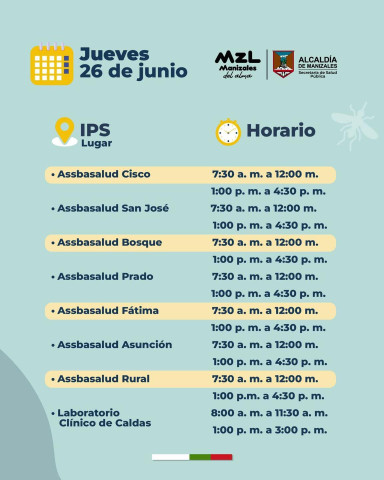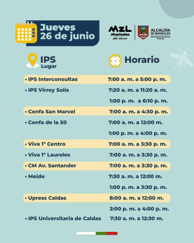 La Secretaría de Salud Pública de Manizales continúa con su campaña de inmunización frente a la fiebre amarilla en la ciudad, esto ante la premisa de que la alerta epidemiológica se mantiene. Pínchese hoy (26 de junio).