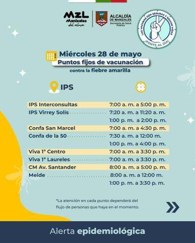 Vacúnese hoy (28 de mayo) en Manizales contra la fiebre amarilla, una enfermedad viral que ataca con mayor severidad a niños, adultos mayores y personas inmunosuprimidas.