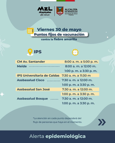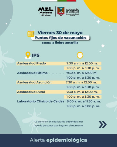 La Secretaría de Salud Pública de Manizales, dirigida por David Gómez, insta hoy (30 de mayo) a quienes no se hayan colocado aún el biológico contra la fiebre amarilla, a buscarlo en el menor tiempo posible.
