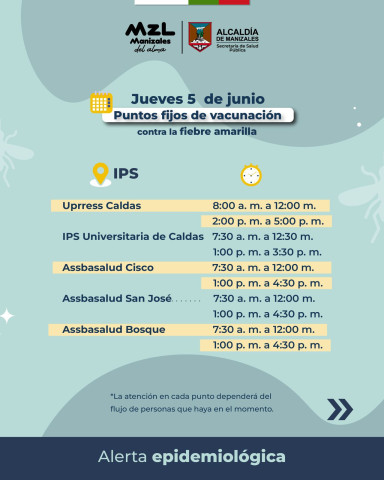 Saque tiempo y vacúnese hoy (5 de junio) contra la fiebre amarilla, si vive o pasa por Manizales. Aproveche que es gratis, recuerde que es un biológico seguro y con el visto bueno del Ministerio de Salud y Protección Social y de la Organización Mundial de la Salud (OMS).
