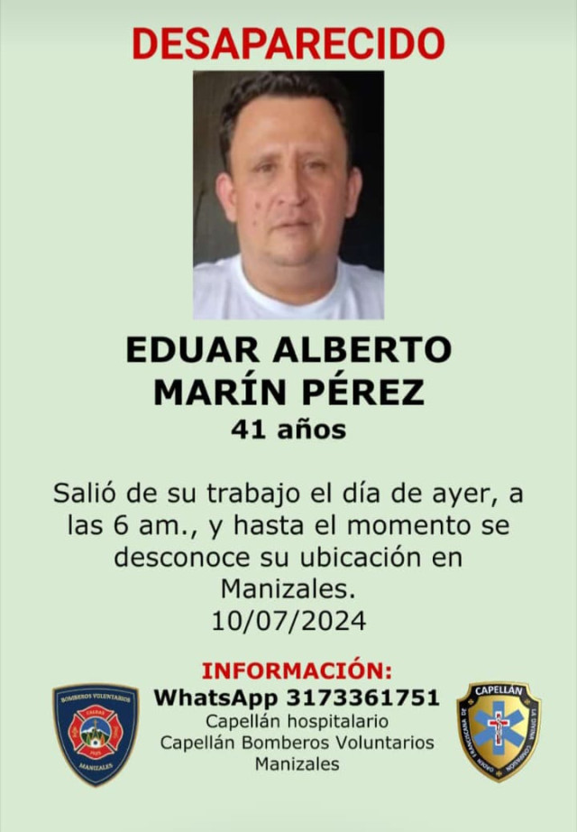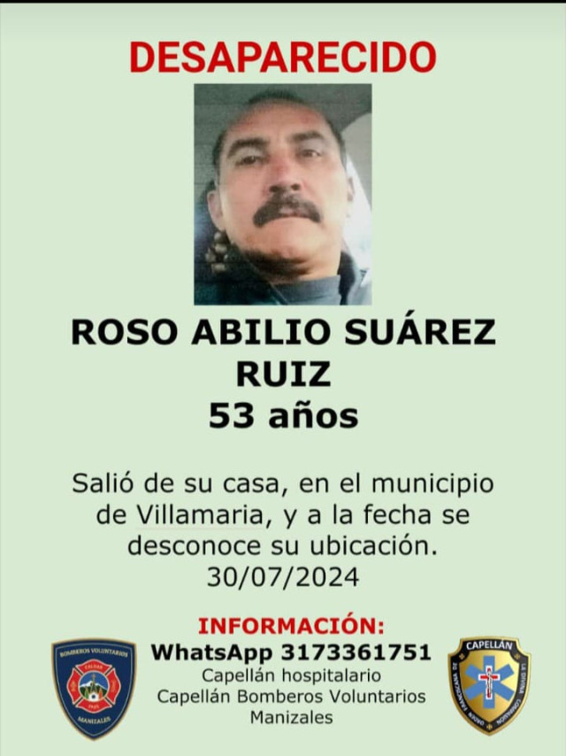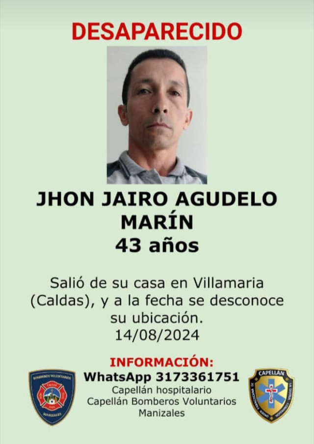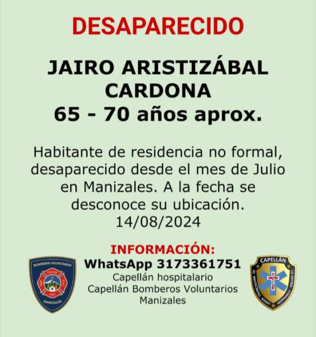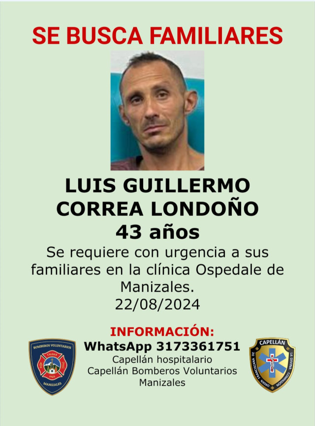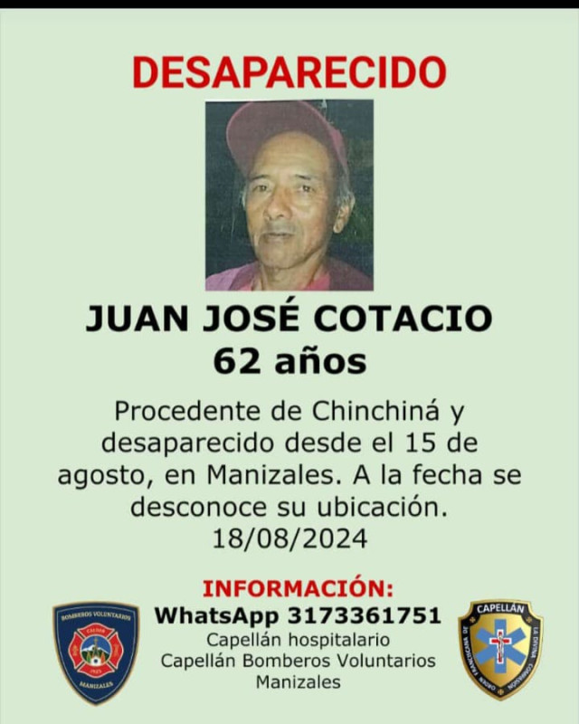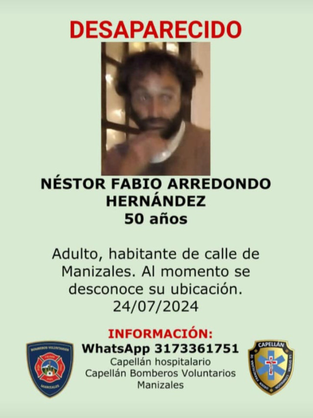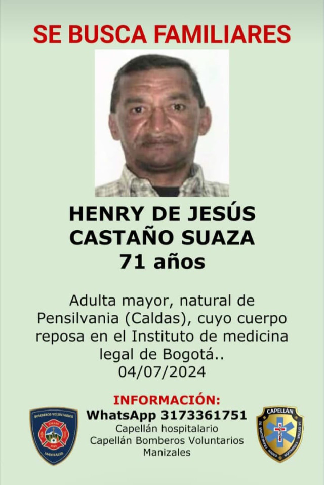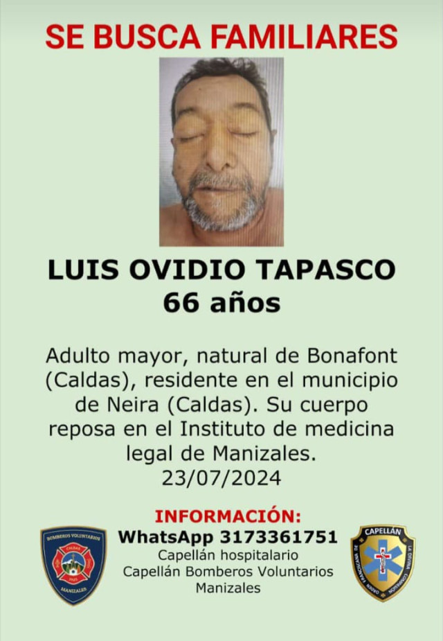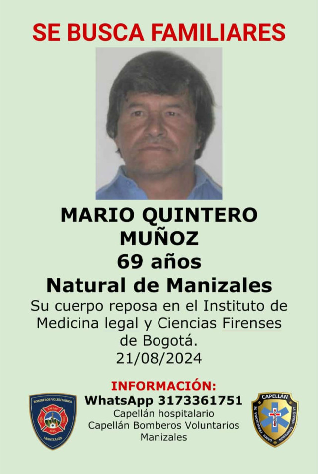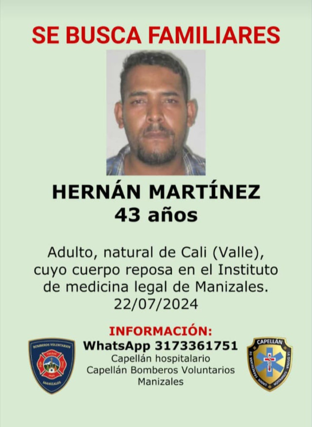 Sucesos 2024-08-22 Una de ellas. Autor Redacción Judicial Estas personas están reportadas como desaparecidas o murieron y sus cuerpos reposan en Medicina Legal, esperando que alguien los reclame. Si conoce a alguna no dude en colaborar llamando o escribiendo al 317 336 17 51, de fray Juan Torres, capellán hospitalario. Temas Destacados (etiquetas) Desaparecido Caldas Manizales