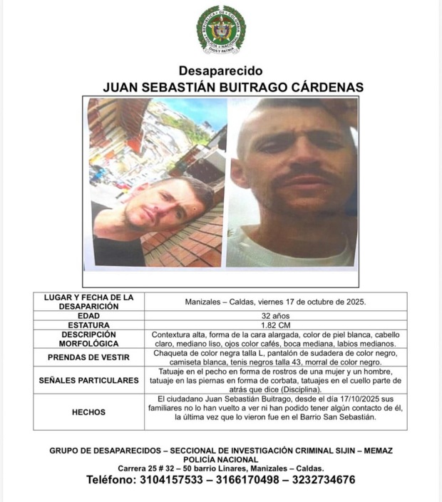 No cesa el clamor de la familia de Juan Sebastián Buitrago Cárdenas, desaparecido en Manizales desde el pasado viernes 17 de octubre. Se cumplen hoy martes (11 de noviembre) 25 días sin rastro de él.