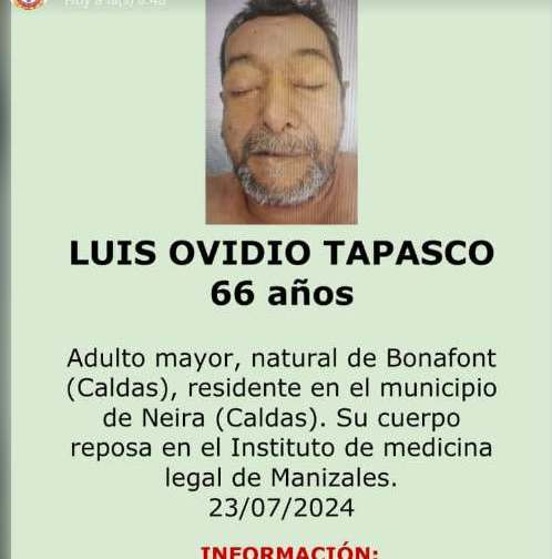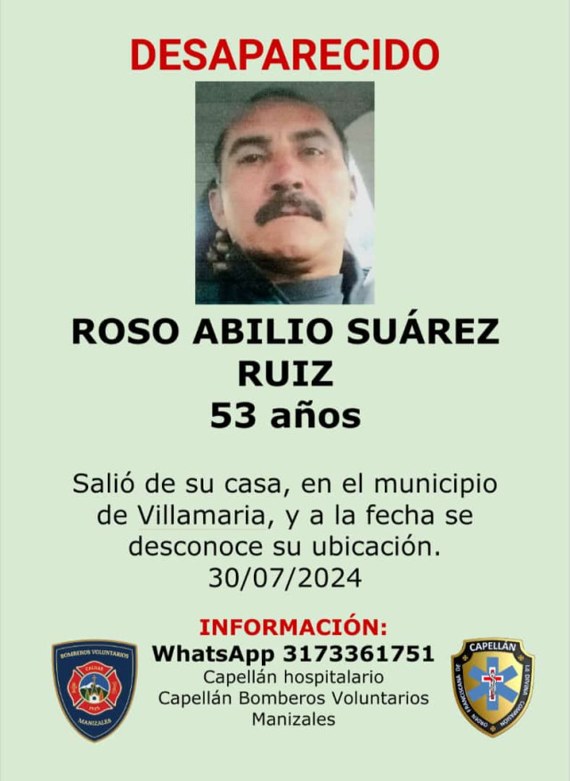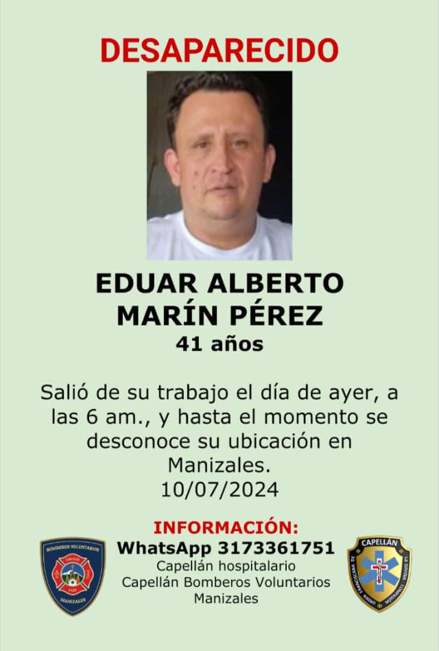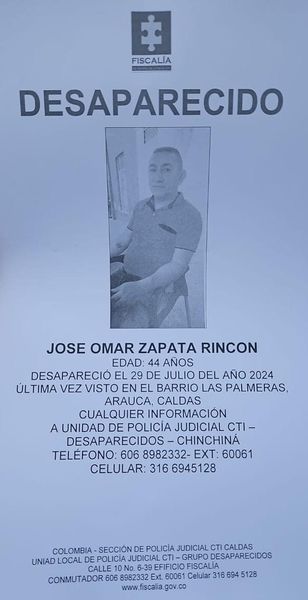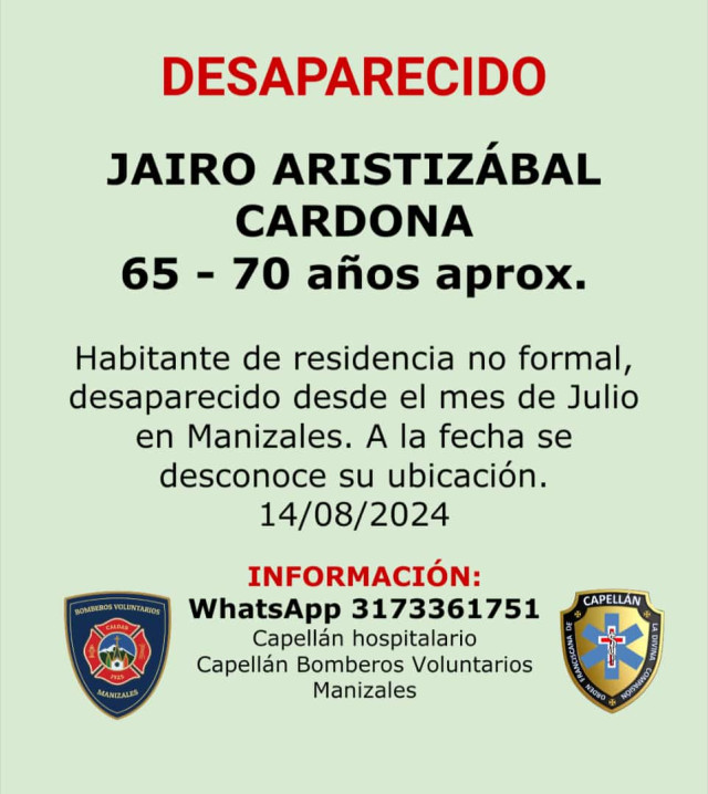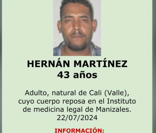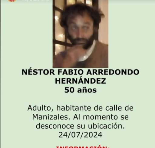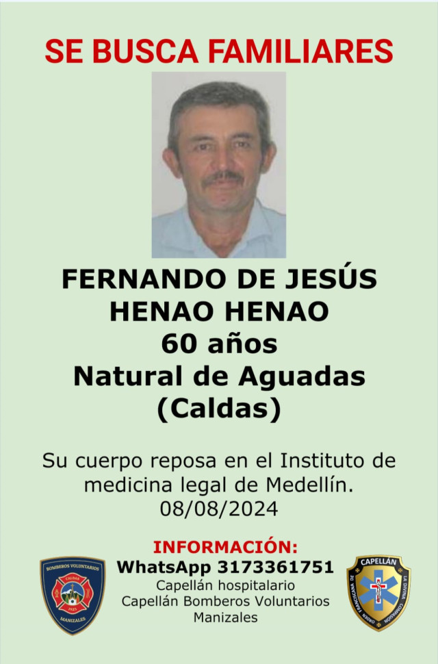 Sucesos 2024-08-14 Caso más reciente. Autor Redacción Judicial 317 336 17 51 es el Whatsapp al que puede escribir si ha visto a estos desaparecidos o si sabe quiénes son los familiares de estas personas que fallecieron y permanecen en las morgues. También puede comunicarse con la línea 123. Temas Destacados (etiquetas) Desaparecido Manizales Caldas