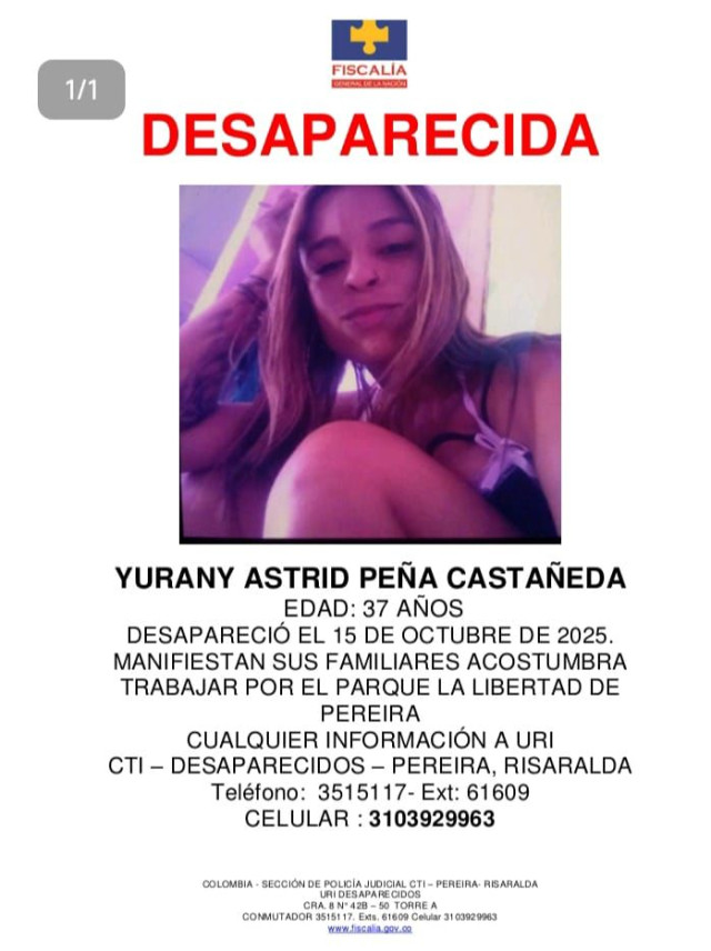 La Fiscalía solicitó a la ciudadanía que, en caso de tener información sobre su paradero, se comunique con la URI de Desaparecidos del CTI Pereira a los teléfonos 3515117 ext. 61609 o al celular 3103929963.