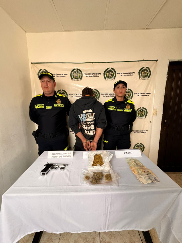 Le encontraron una pistola traumática, 590 gramos de marihuana y $410 mil en efectivo. Según las autoridades, tenía injerencia en los barrios Restrepo y La Esperanza, "usando un taller de mecánica de motos como fachada de la actividad ilícita de venta de estupefacientes". Registra 3 anotaciones.