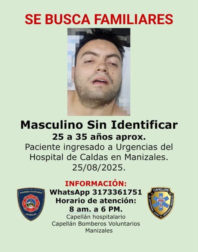 Sucesos 2025-08-26 La persona de la que buscan familia. Autor Redacción Judicial Si conoce a este joven puede comunicarse con el número del aviso, llamar al 123 o acudir a un CAI. LA PATRIA conoció que un taxista lo llevó al Hospital de Caldas, al parecer con problemas de salud. Permanece en UCI. Se desconoce su nombre. Otro caso Temas Destacados (etiquetas) Desaparecido Manizales