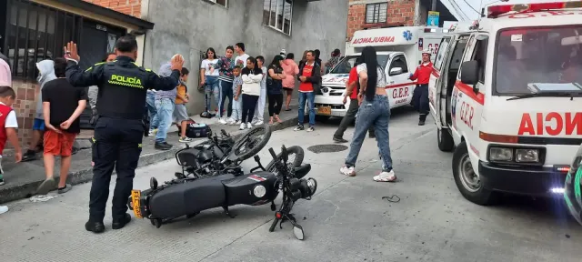 El segundo caso ocurrió a las 5:30 p.m. en la carrera 7F con calle 51, en el barrio Solferino. Dos motos colisionaron. Esdeiber Isiber Quintero Cardona, de 20 años, y Nicolás Gallego Díaz, de 22 años, resultaron heridos y los trasladaron al Hospital de Caldas y a la Clínica de la Presentación, respectivamente.