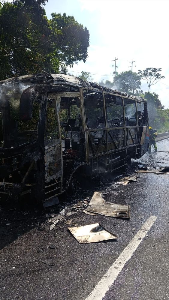 Un bus de servicio público se incendió, generando, al parecer, pérdida total del vehículo.