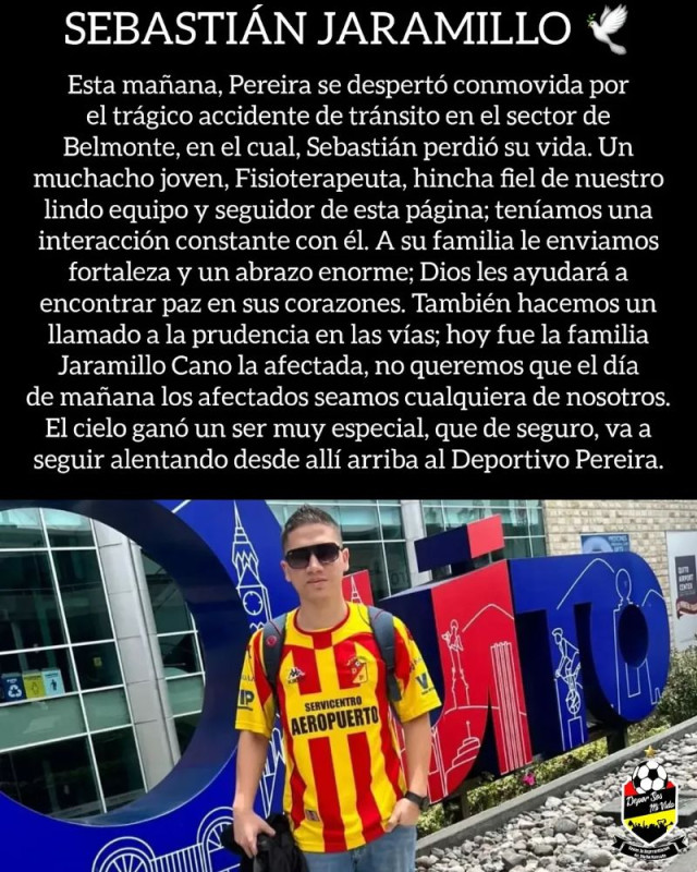 Sebastian Jaramillo, un joven hincha del Deportivo Pereira de 28 años, falleció en el lugar luego de que su carro perdiera el control, cruzara la calzada y chocara contra otro automóvil.