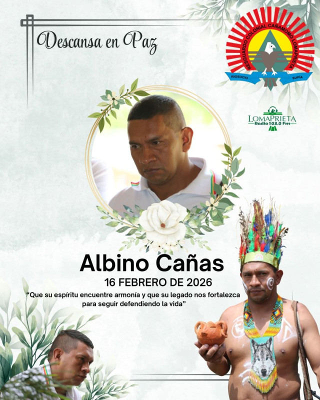 "Con profundo dolor, el Resguardo Colonial Cañamomo Lomaprieta informa a la comunidad que nuestro compañero y Cabildante Albino Cañas, de la comunidad de Portachuelo, ha fallecido tras los lamentables hechos ocurridos en las últimas horas".