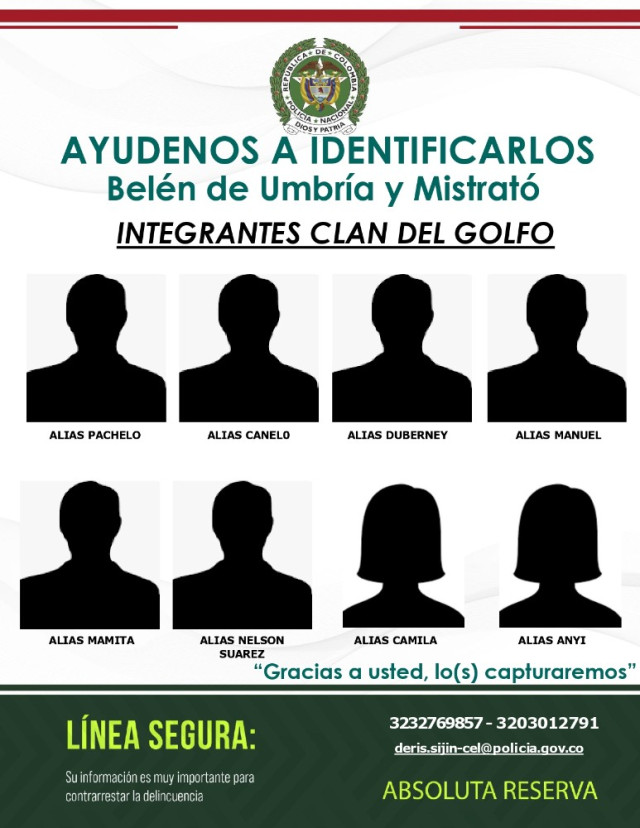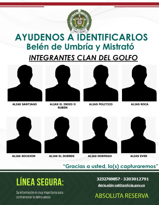 En total son 16 alias pertenecientes a la organización criminal del Clan del Golfo, que opera en diferentes zonas del departamento, especialmente en los municipios de Mistrató y Belén de Umbría, en el occidente de Risaralda.