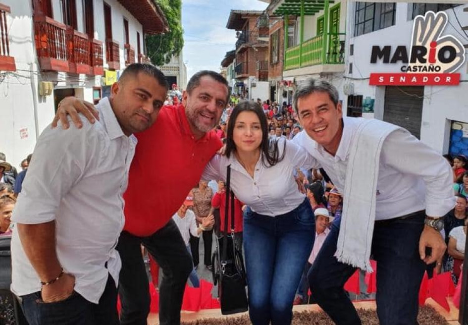 Jackeline Vélez, acompañada del exalcalde de La Merced Jhónatan Vásquez, del fallecido exsenador Mario Castaño y del exdiputado Camilo Gaviria.