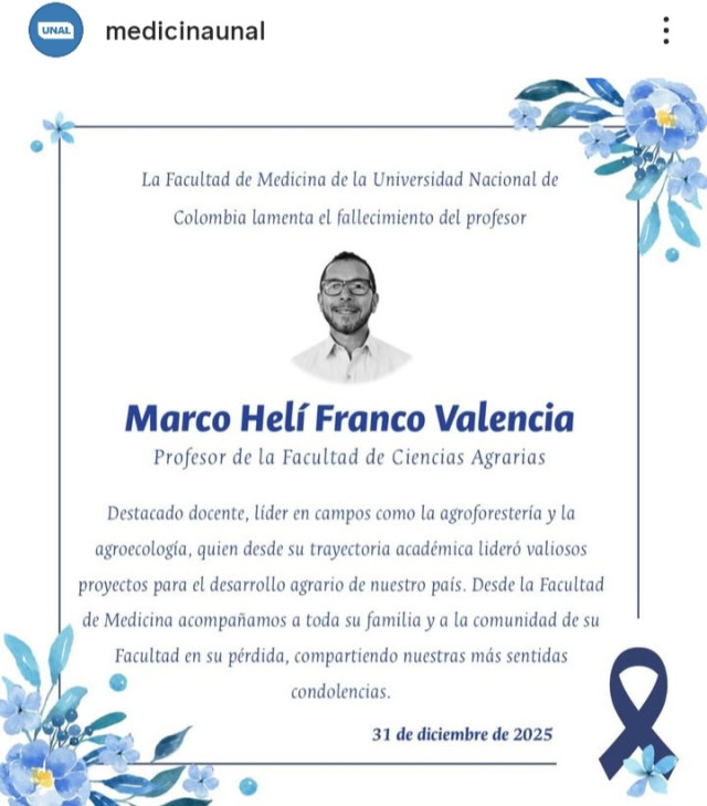 La Facultad de Medicina de la Unal lamentó el fallecimiento de Marco Helí, profesor de la Facultad de Ciencias Agrarias.