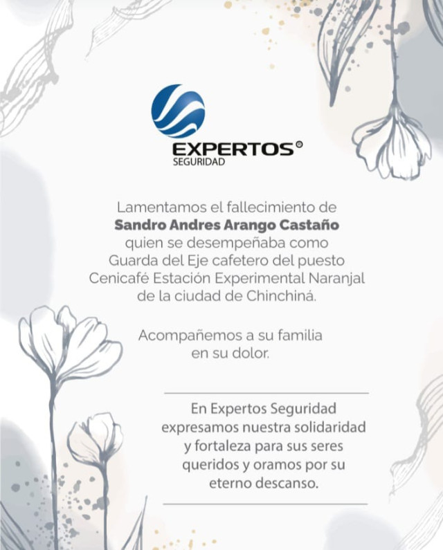Estaba adscrito a Expertos Seguridad y su nombre es Sandro Andrés Arango, de 35 años, según compañeros de labores que aportaron esta imagen. Era pensionado del Ejército y vivía en el barrio La Doctora, de Chinchiná.