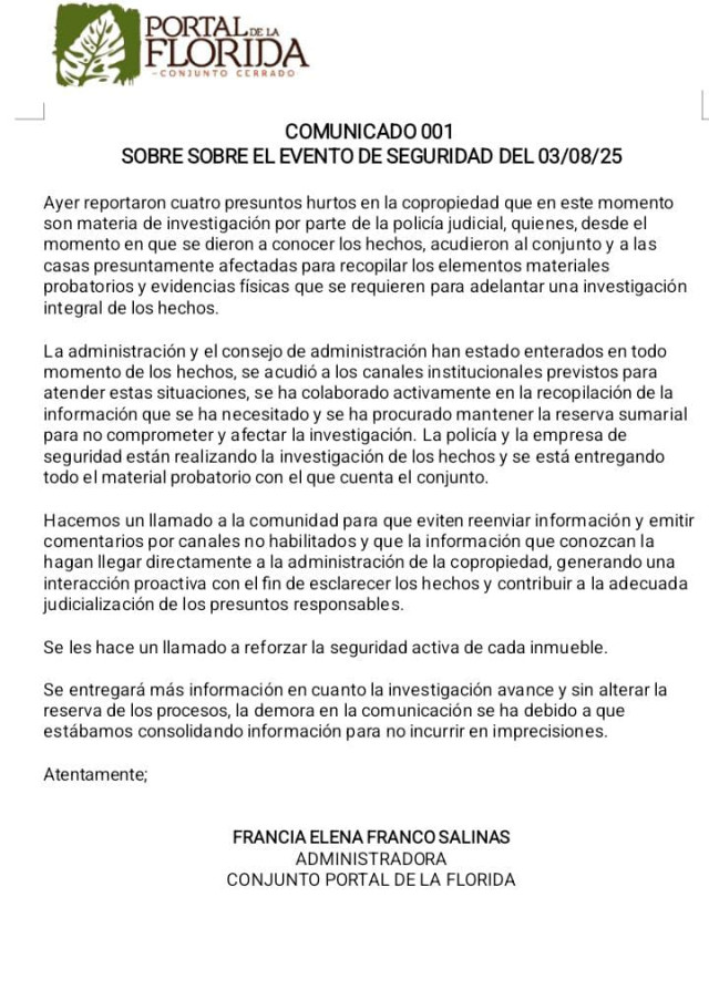 Las autoridades policiales han comenzado la recopilación de evidencias. Se están analizando los videos de seguridad de las cámaras instaladas en el conjunto y sus alrededores con el objetivo de identificar a los responsables del hurto. La comunidad espera resultados efectivos a medida que se avanza en la investigación.