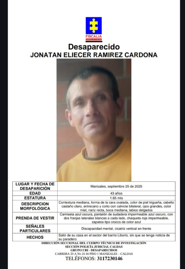 La familia de Jónatan Eliécer Ramírez Cardona, de 43 años, pide la solidaridad de los manizaleños para ayudar a ubicarlo.