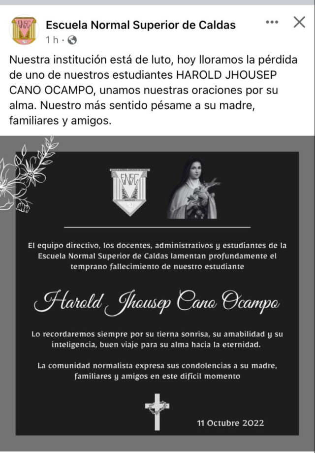 Harold Josep era estudiante de 10º en la Normal Superior de Caldas. Estaba de visita donde la novia, ella le pidió que se fuera en taxi, prefirió caminar y lo hirieron por robarle el celular. Harold era hijo único y reconocido como un joven alegre, estudioso, responsable, amante de la pintura y la música, sin vicios, ni problemas.