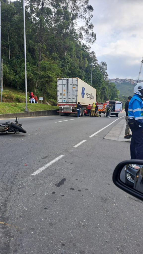 Se indicó que chocaron tractomula y moto. La parrillera de esta última quedó debajo del automotor y habría sufrido fractura en una pierna, con abundante sangrado.