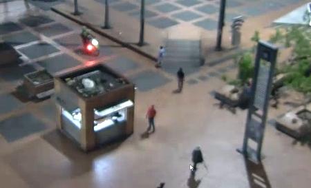 3. Se escondió detrás de un módulo del sector y luego giró hacia unas bancas para simular que estaba sentado en el lugar.