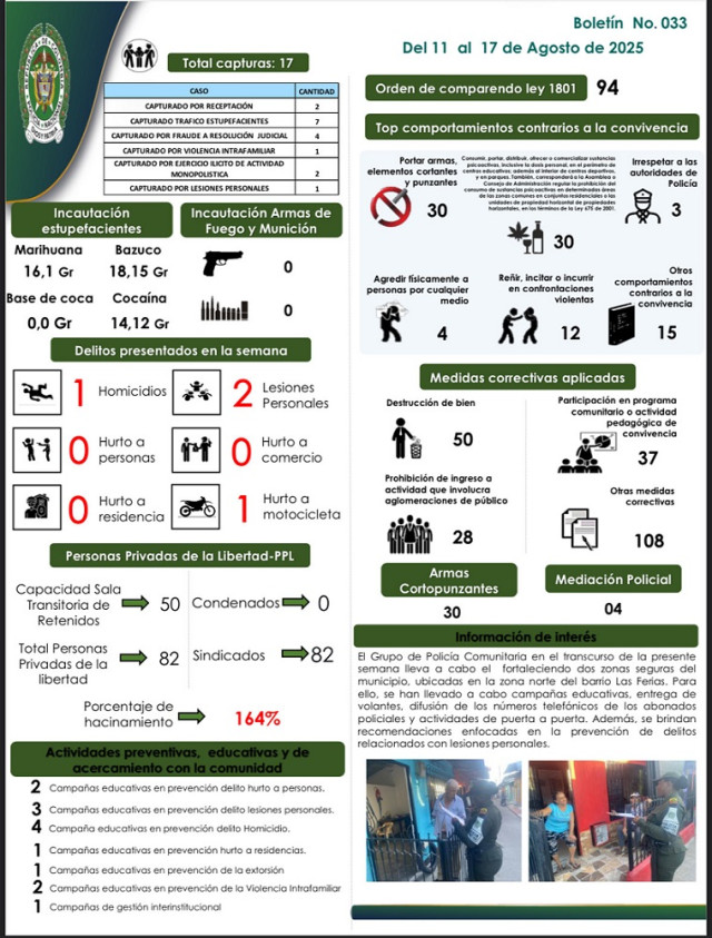 De acuerdo con el balance entregado por las autoridades, se incautaron 18 gramos de bazuco, 16 gramos de marihuana y 14 gramos de cocaína. El informe reveló que se presentaron dos casos de lesiones personales, un homicidio y el hurto de una motocicleta.