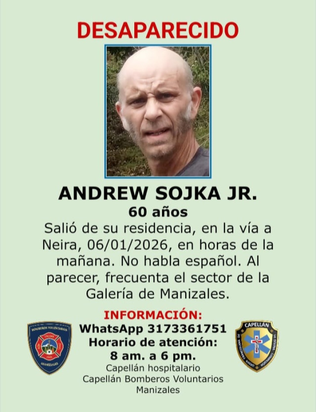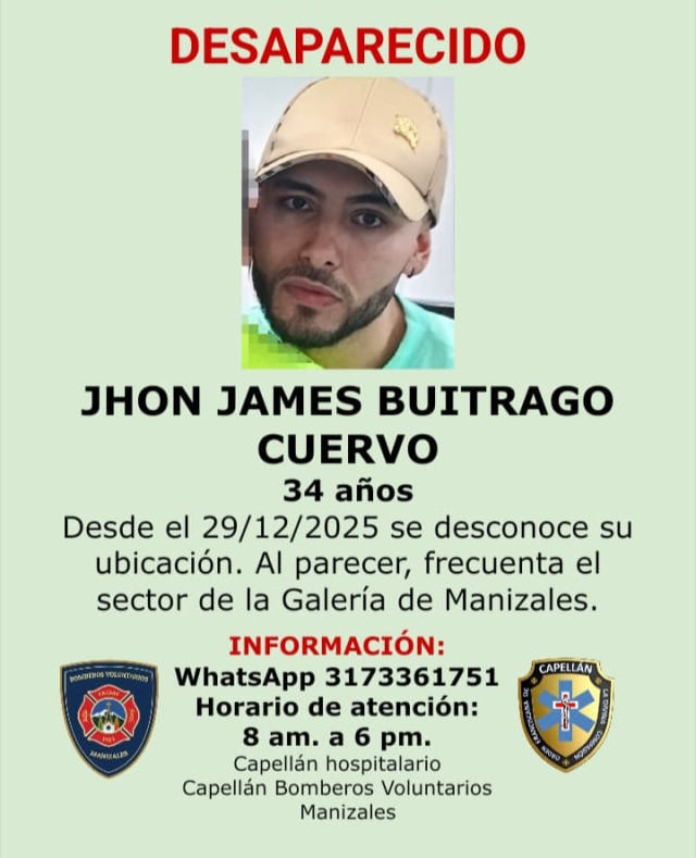 Sucesos 2026-01-06 Uno de los 3 reportados. Autor Redacción Judicial Se reportó la desaparición de 3 personas. Una es de Manizales, pérdida desde finales de diciembre Otro partió de Argentina como mochilero hace unos meses y se cree que puede estar por esta zona y otro extranjero vive en la vía a Neira. Temas Destacados (etiquetas) Manizales Eje Cafetero Argentina Estados Unidos