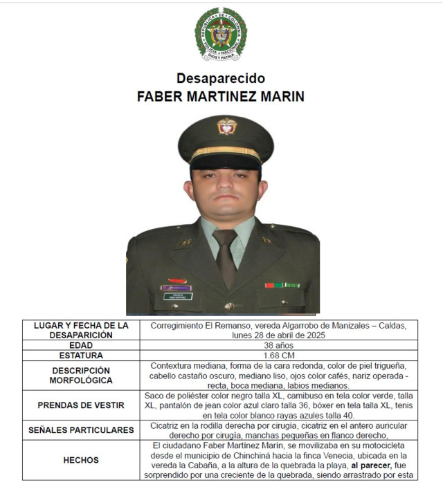 La Policía Metropolitana de Manizales emitió este jueves 1º de mayo un volante donde le pide a la comunidad ayuda para ubicar a Fáber Martínez Marín, de 38 años, desaparecido desde el lunes 28 de abril en la vereda Algarrobo, de esta capital cuando, al parecer, lo arrastró una empalizada. Hace parte de la comunitaria.