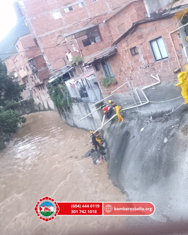 Miembros del Cuerpo de Bomberos de Bello (Antioquia) salvaron un perro de terminar arrastrado por la quebrada La García.