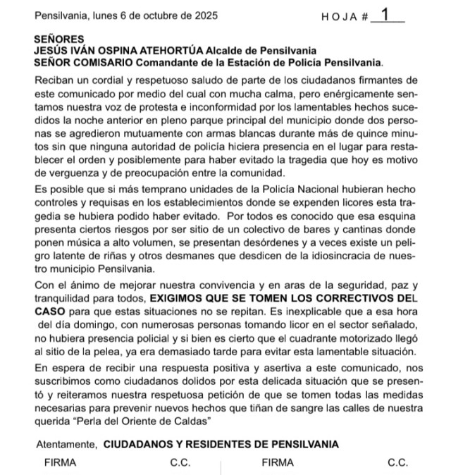 A las 9:30 de la noche de este domingo 5 de octubre, se dio una riña entre dos personas en Pensilvania. Las personas comprometidas fueron Luis Guillermo Vélez Muñoz, de 29 años, con lesión en el pecho, y Johan Eduaimer Quintero Muñoz, de 37, afectado con una herida.