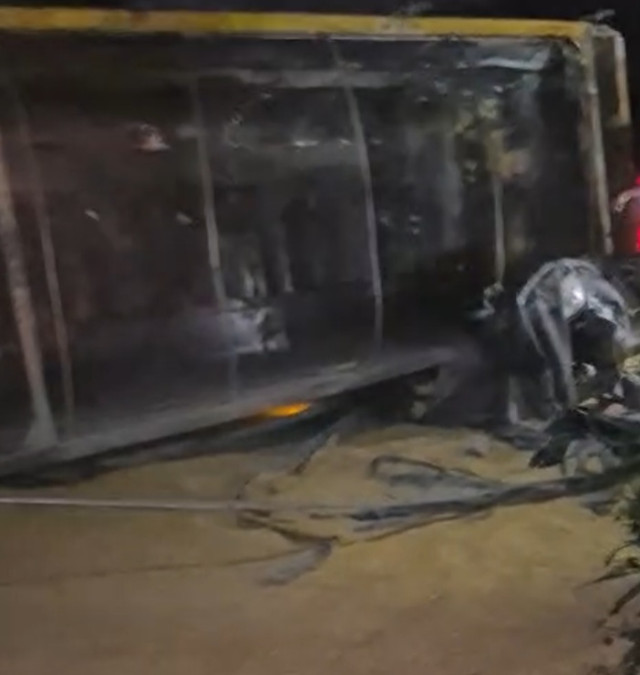 Una tractomula se volcó y cayó sobre un vehículo particular.