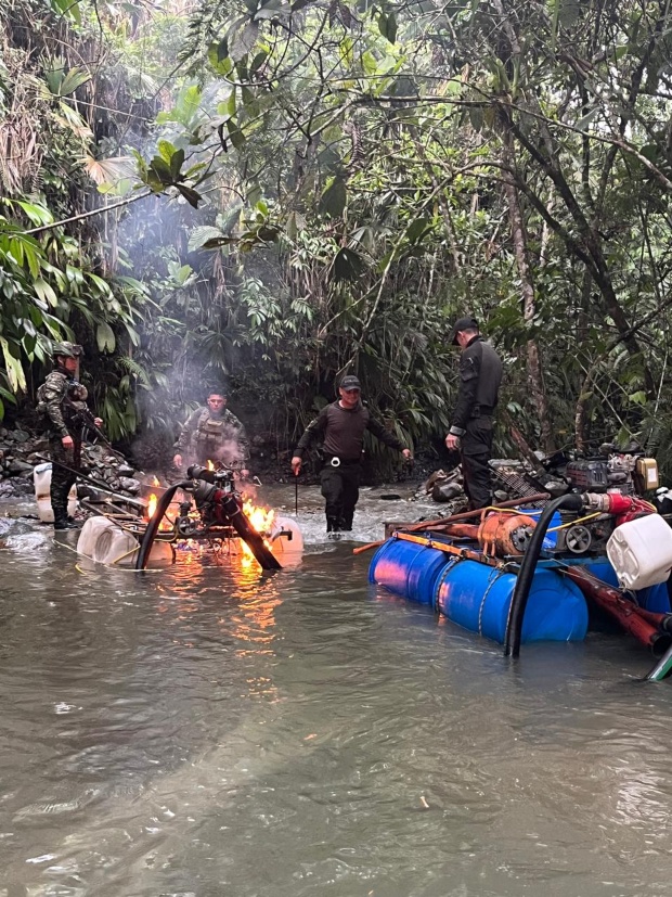 -Durante la acción operativa fueron sorprendidas tres personas ejecutando labores de extracción mediante la modalidad de dragado artesanal sobre la quebrada. En el procedimiento se incautaron tres dragas utilizadas para la explotación ilegal y seis motobombas, elementos avaluados en $36 millones.