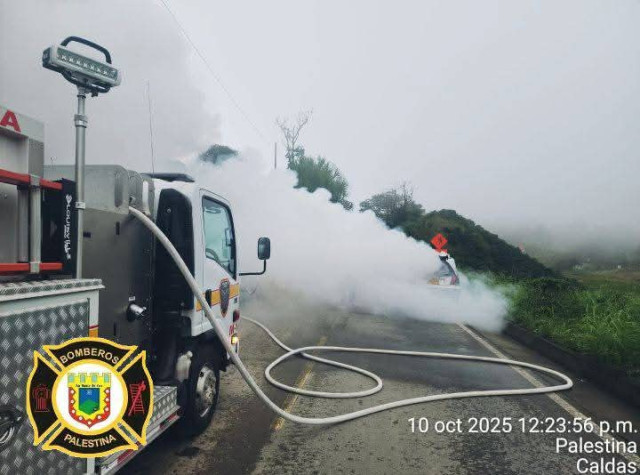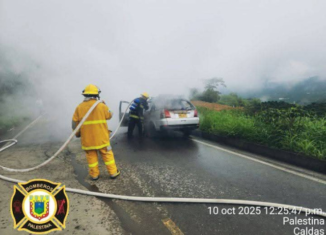 Al mediodía de este viernes 10 de octubre, personal de bomberos atendió un incendio vehicular en la vía que conduce de Palestina a la vereda Cartagena, específicamente en el sector Villa Juliana, en Caldas.