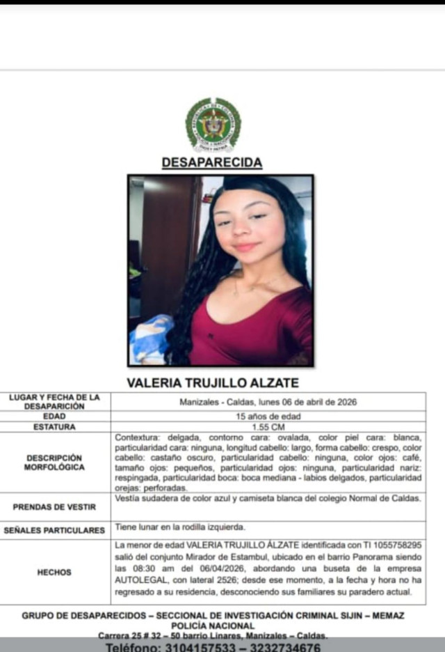 Valeria Trujillo Alzate, de 15 años, es buscada por su familia en Manizales desde este lunes (6 de abril). Según sus allegados, abordó una buseta de Autolegal a las 8:30 de la mañana al salir del Mirador de Estambul, en el barrio Panorama, y desde eso no saben de su paradero.