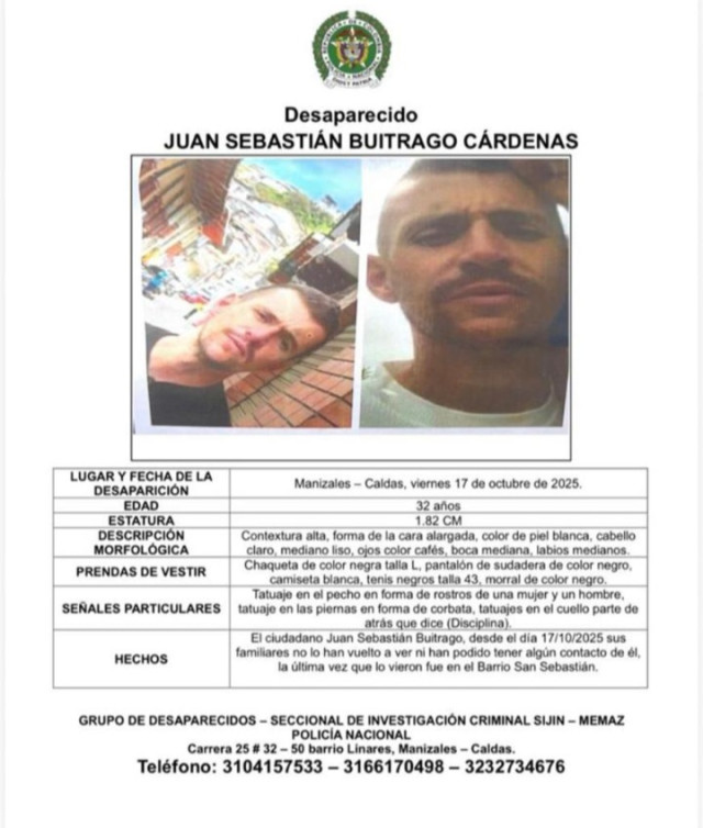 Familiares y amigos de Juan Sebastián Buitrago acuden a la solidaridad de los manizaleños para dar con el paradero de esta persona, de la que no saben nada desde el pasado viernes 17 de octubre.
