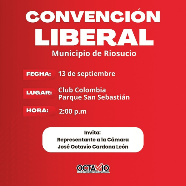 Riosucio. La Convención Liberal está prevista para hoy, a las 2:00 p.m., en la sede del Club Colombia. “Serán escuchadas propuestas, ideas, inquietudes, pues el Partido Liberal ha sido protagonista de la vida política y administrativa de Riosucio, queremos escuchar a la gente”, dijo en un comunicado el representante a la Cámara, José Octavio Cardona León, promotor de la actividad. Líderes y simpatizantes del Partido se muestran optimistas para lograr la Unidad de esta colectividad y diseñar un plan de trabajo, pensando en el futuro del municipio.
