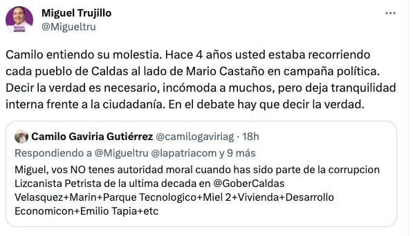 Manizales. El diputado Camilo Gaviria también salió a responderle a Miguel Trujillo. “De acuerdo, hay que decir la verdad. Me alegra que acepte lo que ha sido el actuar, las irregularidades y los malos resultados de las administraciones en las que usted ha trabajado y apoyado. Pd: gratitud con el @PartidoLiberal que me apoyó. Yo no me escondo con firmas”.