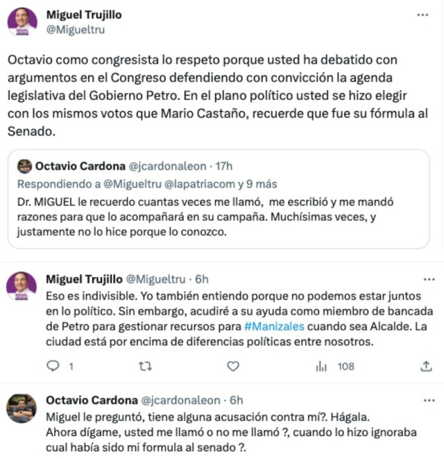 Manizales. Octavio Cardona no demoró en responderle a Miguel Trujillo en Twitter al video en el que recuerda su pasado con Mario Castaño y critica su apoyo a Jorge Eduardo Rojas. El congresista evidenció que Trujillo lo buscó antes para su campaña y le pidió que si tenía alguna acusación la hiciera. El aspirante le dijo que entendía sus diferencias políticas, pero una vez en la Alcaldía acudiría a él como congresista. Cardona le dijo: "Parece que lo entendió, pero muchísimo después de haberme llamado muchas veces y haberme mandado muchas razones. Si no lo entendía ya era caso clínico. Feliz día". Además publicó un pantallazo de una noticia de El Tiempo en la que se menciona la polémica en la que estuvo Trujillo hace 10 años, cuando era gerente de la Industria Licorera de Caldas, y grabó al gobernador Juan Martín Hoyos. "El estilo del señor es muy sencillo", escribió Cardona. El candidato al día siguiente sostuvo: "¡Amanecí FELIZ! A pesar de los ataques simplemente por decir la verdad, la gente es cariñosa y me llena de energía e ilusión".