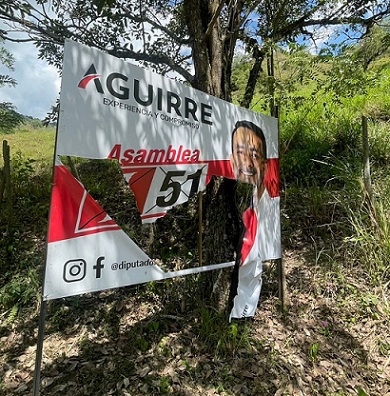 La Merced. Esta valla del candidato a la Asamblea de Caldas, Jorge Hernán Aguirre fue vandalizada en La Merced. Un ciudadano, a través de su cuenta de Facebook, expresó: “Es triste que aún se presenten tan lamentables hechos en nuestro municipio”.