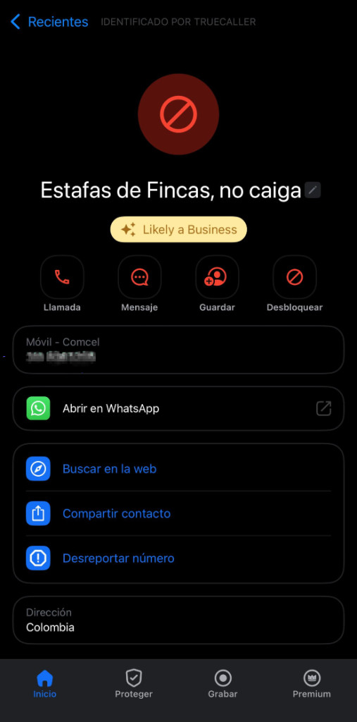 Presunta estafa de alquiler de fincas identificada por Jaime Restrepo, CEO de la empresa de seguridad informática Dragon Jar. Así se ve la llamada de los números identificados como posibles estafas en Truecaller.